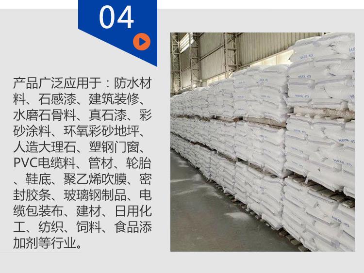 橡膠、塑料、塑鋼門窗、PVC電纜料 、高級涂料、管材、輪胎、鞋底、聚乙烯吹膜、密封膠條、玻璃鋼制品、電纜包裝布、造紙、建材、油墨、日用化工、紡織、飼料、食品添加劑